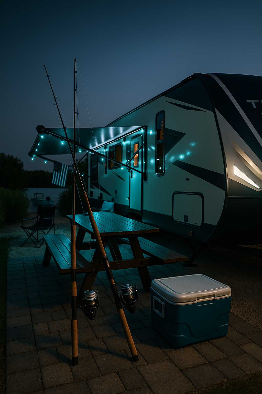This ain’t your typical roughin’-it trip. We roll out our beautiful, fully-stocked Toy Hauler — set up and ready for you at the campground. Spend your time chasin’ bass by day, relaxin’ by the campfire at night, and enjoyin’ guided freshwater fishing charters included with your stay. It’s the perfect mix of fishin’, chillin’, and memory-makin’.